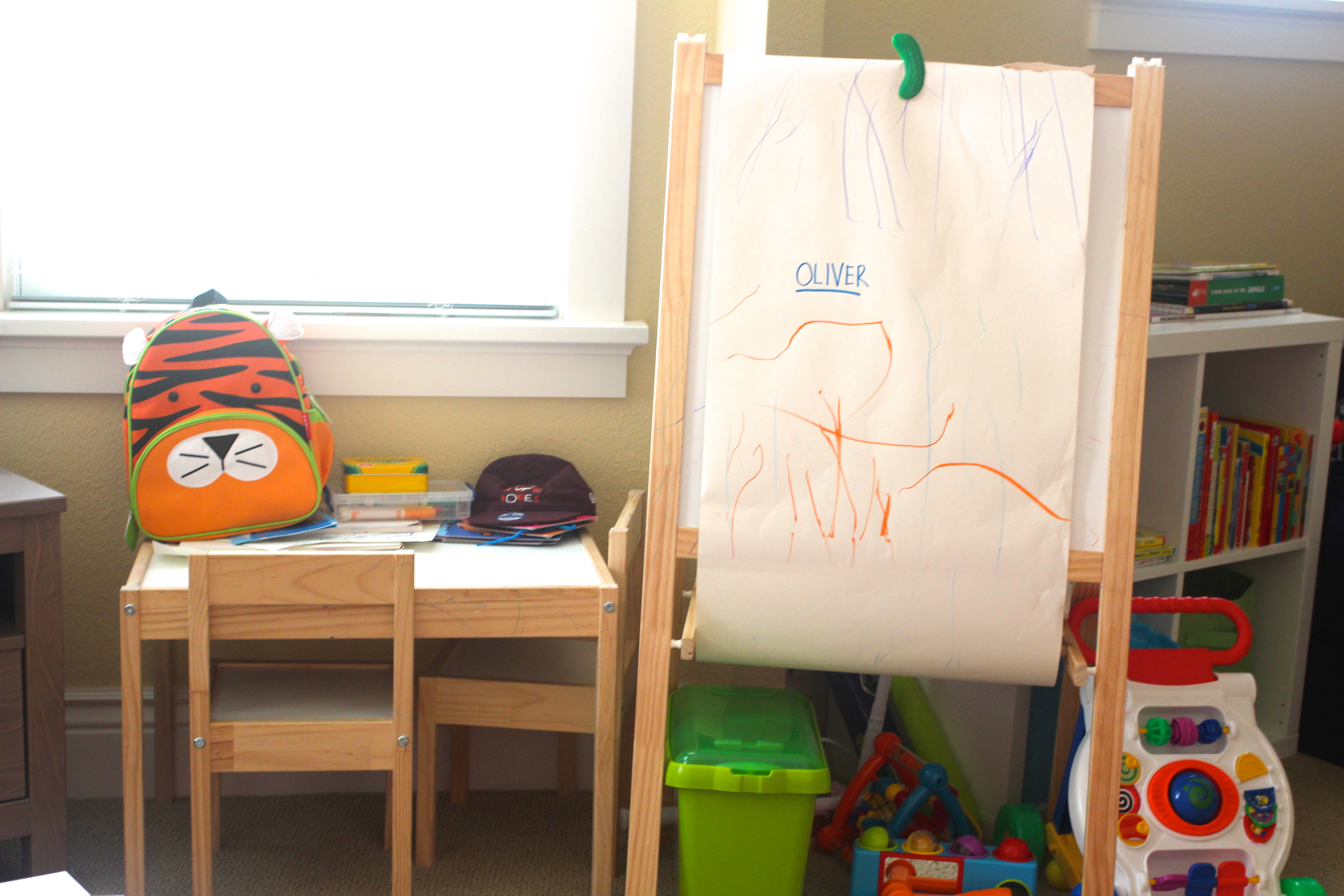 I also like how we are able to use Oliver’s chair, after it was on hiatus the last year (I took Oliver’s monthly photos in this chair when he was first born.). Even though he can’t “read” on his own, he will sometimes sit in his chair and look at the books. Hopefully it will be a true reading nook in the future. And the chair is awesome because adults can sit in it too, and it’s light and portable enough that we can move it around the house. The chair is from Pottery Barn Kids.